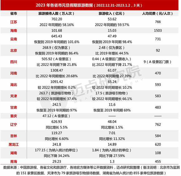 2023年元旦假期是防控实施“新十条”优化措施后的首个小长假,各地旅游市场回暖趋势明显,但刚刚“阳康”后的人们出行保守谨慎,恢复程度有限。从全国和各省公布的元旦旅游数据看,无论是旅游人数还是旅游收入,“悲中有喜”、整体趋势向好,表现了文旅市场的发展韧性与前景。