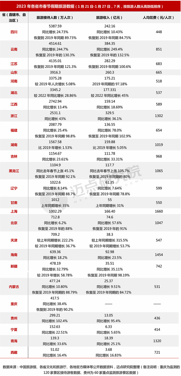 据迈点研究院统计的25个省市春节旅游数据分析:
