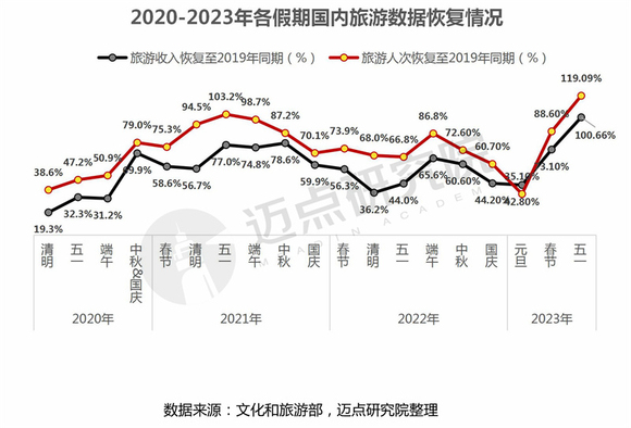 受国内宏观政策利好的影响,2023年元旦、春节相继迎来明显回暖与好转,且向好趋势确定性不断增强。据文化和旅游部发布的元旦和春节数据显示:元旦假期,国内旅游出游5271.34万人次,恢复至2019年同期的42.8%;实现国内旅游收入265.17亿元,恢复至2019年同期的35.1%。