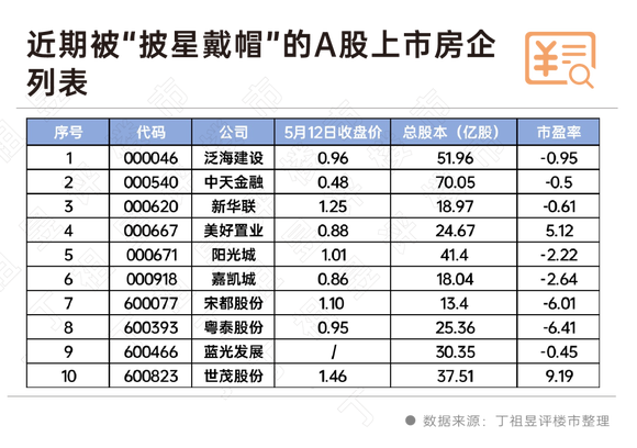到目前为止,有10家A股上市房企被“戴帽”。除很可能成为A股首家退市房企的*ST蓝光外,还有嘉凯城、泛海控股、新华联、美好置业、阳光城、宋都股份、世茂股份、粤泰股份等。