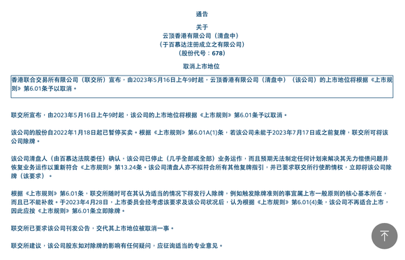 据香港联交所,自5月16日上午9时起,云顶香港(00678.HK)的上市地位将根据《上市规则》第6.01A(1)条予以取消。云顶香港股票自2022年1月18日起已暂停交易。