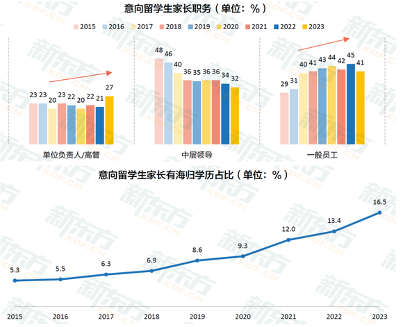 新东方还对意向留学生的家庭情况做了调查,根据《白皮书》连续九年的调研数据显示,普通家庭仍是主力军,海归背景家长逐年呈攀升趋势。