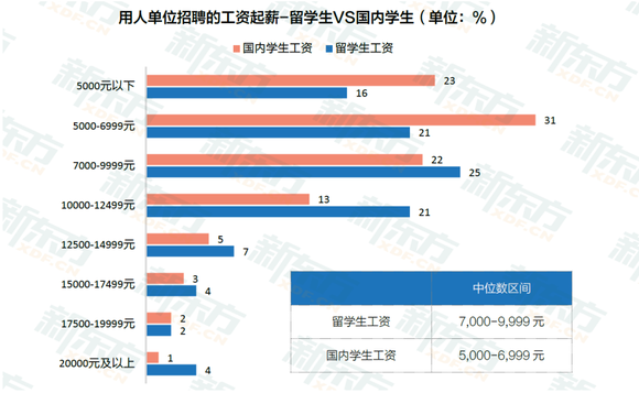 2023年调研数据显示,留学生起薪普遍高于国内高校毕业生。留学生工资的中位数区间位于7000-9999元,而国内学生的中位数区间位于5000-6999元。《白皮书》认为,用人单位在招募国内外高校毕业生时,更加认可留学生在就业市场上的竞争力,也更愿意给他们支付更高的薪资。
