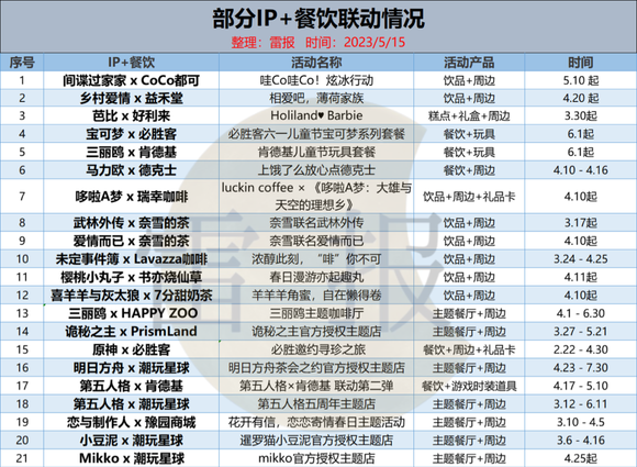 雷报对今年部分“IP+餐饮”的联动情况进行了整理。