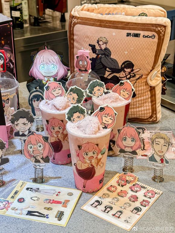 第一,联名套餐形式。这也是最常见、最实用的一种联动形式,通常会将连锁餐饮的部分线下门店指定为主题店,店内推出IP联名套餐,包含固定餐饮、贴纸挂件等轻周边,以及其他产品。近期CoCo都可和间谍过家家的联动就陆续推出了8款限定套餐,附小夜灯、书本抱枕、摇摇乐盲袋、贴纸等多种类型的周边。
