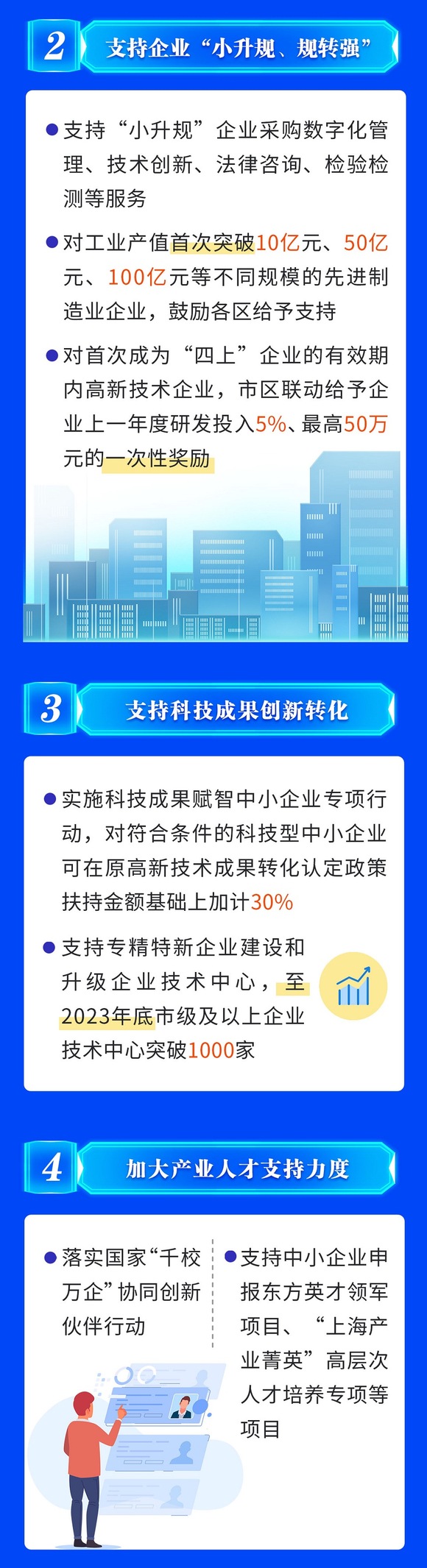 在支持中小企业创新发展方面,《若干措施》提出,上海将实施科技成果赋智中小企业专项行动;对“小升规”企业和工业产值首次突破10亿元、50亿元、100亿元等不同规模的先进制造业企业,鼓励各区给予支持;对首次成为“四上”企业的有效期内高新技术企业,市区联动给予企业上一年度研发投入5%、最高50万元的一次性奖励;实施“上海产业菁英”高层次人才培养专项,提供配套服务和项目资助,每年培育200人。