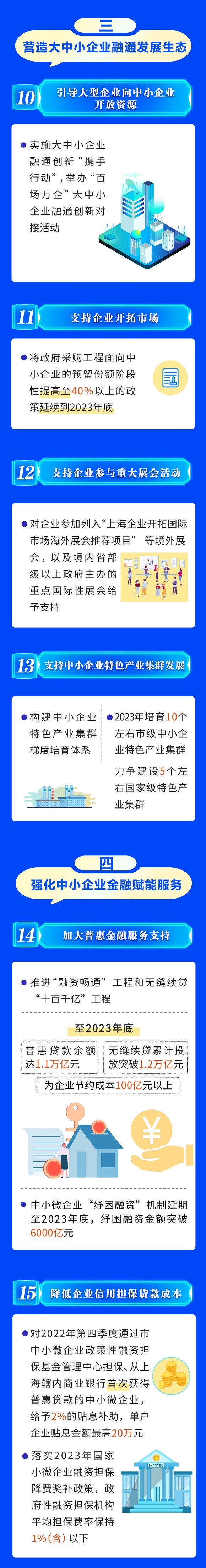 在金融赋能服务方面,《若干措施》整合各项金融助企政策,打出“组合拳”,提出推进“融资畅通”工程和无缝续贷“十百千亿”工程,明确到2023年底上海普惠贷款余额达1.1万亿元、无缝续贷累计投放突破1.2万亿元,为企业节约成本100亿元以上;明确中小微企业“纾困融资”机制延期至2023年底,纾困融资金额突破6000亿元。