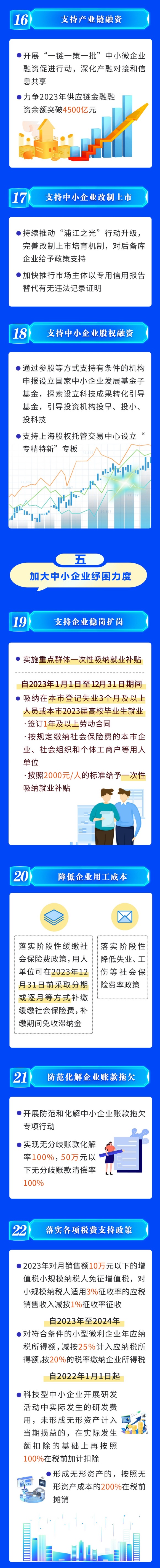 《若干措施》明确上海支持中小企业稳岗扩岗,落实阶段性降低失业、工伤等社会保险费率政策;开展中小微企业助企纾困专项行动,发挥中小企业服务专员作用,开展政策上门对接。