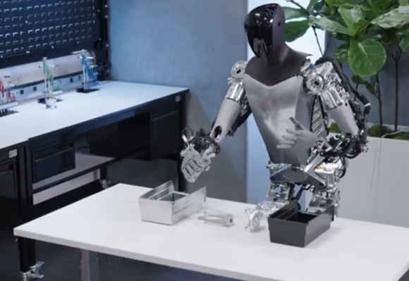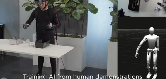例如,Optimus人形机器人可以从一个容器中拾起物体,并将它放入第二个容器中。视频还显示,人类工作人员佩戴传感器后,其抓取物品的动作可以被AI算法识别,并将动作复制到机器人身上。