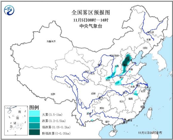 预计,5日早晨至上午,北京、天津、河北中南部、河南北部和西南部、陕西关中、山西中南部等地有大雾,其中,北京中南部、天津中西部、河北中南部、河南北部、陕西关中、山西南部等地的部分地区有能见度低于200米的强浓雾,局地有能见度不足50米的特强浓雾。