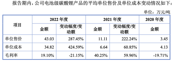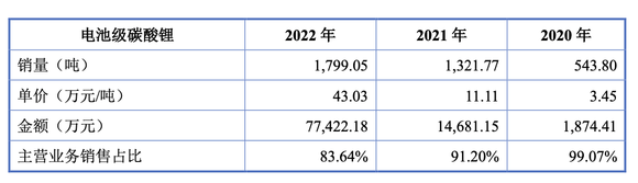 而公司业绩暴增主要在于赶上新能源动力电池发展红利,电池级碳酸锂实现量价齐升。报告期内,公司电池级碳酸锂销售收入分别为1874.41万元、1.47亿元、7.74亿元,期间增幅达到3973.68%,其中销售平均单价分别为 3.45万元/吨、11.11万元/吨、43.03万元/吨。