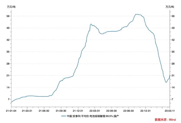 Wind数据显示,2021年电池级碳酸锂产品供需紧张,全年价格处于上行区间,从年初的5.30万元/吨增长至年底的27.50万元/吨,增幅418.87%。2022年,电池级碳酸锂市场价格全年维持高位运行,年中和年末各经历一次下跌,从年初的27.80万元/吨一路上行,当年11月甚至一度逼近60万元/吨的新纪录,随后出现下跌至2022年末的51.20万元/吨。