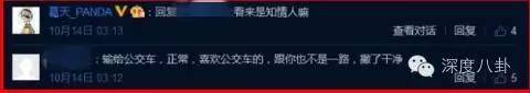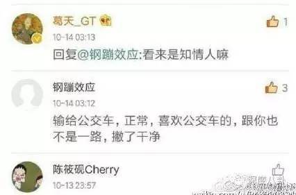 这次事件的导火索是某娱乐博主在10月30号的晚上发微博,贴了一张微博评论截图,爆点在第一条,显示有网友留言说“葛天是输给了公交车”,葛天接着回复“看来是知情人嘛”,这样的对话明眼人都看的出来是葛天在说吴莎是公交车。