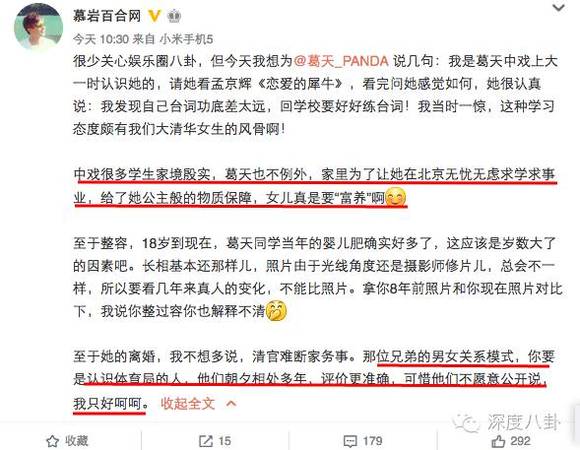 我是偏向相信是属于后者。因为从葛天微博的评论来看,如果她真的说了这样的话,不可能没有网友发现加以评论,如果你说她已经都给删除了那也未免动作有点太快。还有,这早该在10月14日当天就成为头条,而不是在半个多月后突然冒出,也太低估了八卦网友和媒体们的实力。