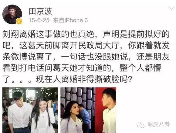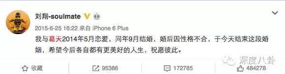 直到去年6月25号,刘翔在微博上宣布和葛天离婚,两人这段9个月的婚姻正式画上了句号。