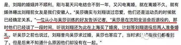 再然后就是吴莎出场了。虽然刘翔和吴莎是在今年1月9号公开的恋情,但实际上在刘翔宣布离婚后的没几天,吴莎老家安徽的报纸《大江晚报》就报道了刘翔和吴莎在一起的消息,还扒出刘翔2009年就和吴莎相恋的往事,不过文内的许多报道失实,没有引起广泛的关注。