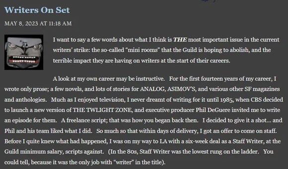《权力的游戏》原著作者、剧版编剧乔治·马丁就在支持好莱坞编剧罢工的文章中,以自己的职业道路为例说明了这一模式对编剧的伤害。在1985-1995年之间,他以编剧的身份参与到几部美剧的制作,总在片场观察演员的表演,从拍摄到后期剪辑的全制作过程中他都在,这都为他后来的编剧生涯打下了基础。