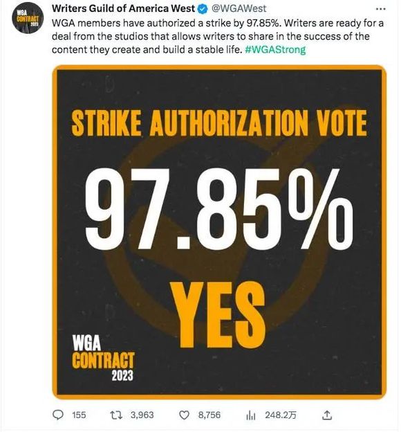 “如果我们现在不努力,三年后就没有什么可争取的了。”WGA的成员、编剧Jacqmin说:“我会用‘绝望’这个词。”4月中旬,WGA进行投票时,决定性的97.85%的人赞成罢工。