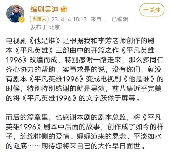 在剧集被嘲的时候,编剧是被寄刀片的那个,仅就今年,《他是谁》《长月烬明》的编剧就都在微博上隐隐吐槽过剧情并非他们所写的样子。在剧集爆红之后,编剧又是被舆论场忽视的那个。就说今年两部爆款剧,都知道《狂飙》里的高启强是张颂文,《漫长的季节》由辛爽导演,那么请问两部剧的编剧是?