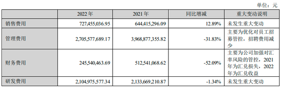 财报数据显示,蓝思科技2022年财务费用、管理费用分别支出2.46亿元和27.06亿元,相较2021年同期缩水2.67亿元、12.63亿元,降幅分别为52.09%和31.83%。