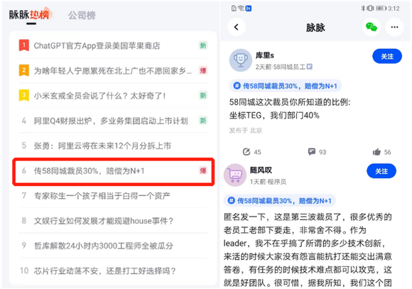 截止发稿时,经过一夜发酵的“58同城裁员30%”词条仍挂在脉脉热榜第六名。点进去可以发现,不少带着“58同城员工”认证的用户也在发文,印证了相关信息的真实性。