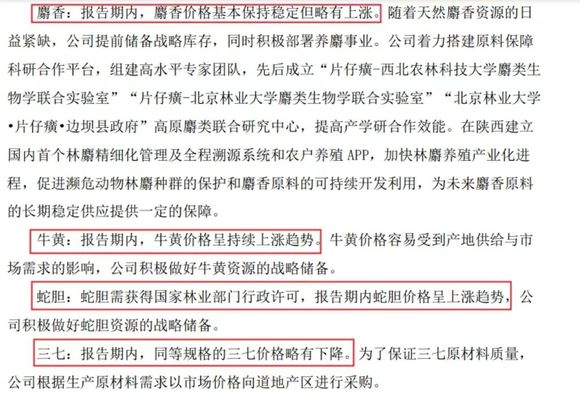 并且,片仔癀指出,从长期看,麝香、牛黄及蛇胆的价格呈上涨趋势,未来将对成本产生上升压力。但据21世纪经济报道,天然麝香的供应并不特别紧缺,一头林麝每年的设想产量约为20克,国内批准使用天然麝香的厂家有15家左右,至今未发现缺货情况。