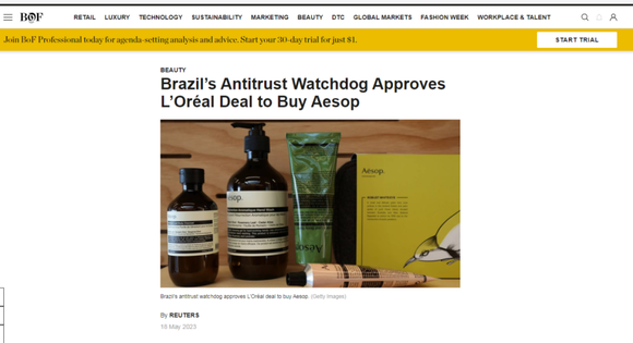 而日前,有多家媒体报道,巴西反垄断监管机构Cade已于5月17日批准将 Natura&Co集团旗下Aesop伊索品牌出售给欧莱雅集团。另根据监管机构的规定,如果没有人提出上诉,批准将在其发布后15个自然日内被视为最终批准。