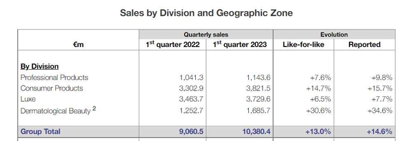 再看欧莱雅集团高档化妆品一季度财务表现。据欧莱雅集团财报显示,2023年前3个月,其高档化妆品部实现销售额约为281.4亿元,相比2022年同期增长约6.5%。