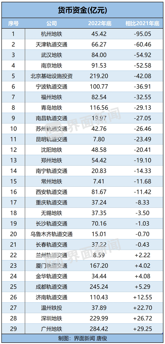 杭州地铁的货币资金减额最多,去年一年减少了95亿元;天津轨道交通的货币资金减少了60亿元,武汉地铁和南京地铁也减少了50亿元以上。