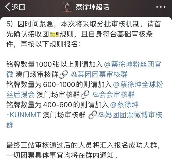 但与五月天不同,本次蔡徐坤粉丝团的团票,条件确实有些“苛刻”。超话13级以上、2月期间购买特辑4份以上两个条件,意味着参与者必须有绝对的活跃度和氪金度,如此之下,不少粉丝在朋友圈看到的黄牛,反而转身科普起团票规则,并好言规劝“抢不到团票的朋友再来我这里”。