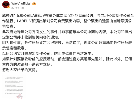 譬如2019年威神V在举办武汉粉丝见面会时,威神V的所属公司LABEL V就将与团票承包给了当地公演制作公司。但该公司却在后续的活动中,被曝出让粉丝承担了所有演出演员的食物和饮料,并威胁粉丝帮忙团队冲热搜。