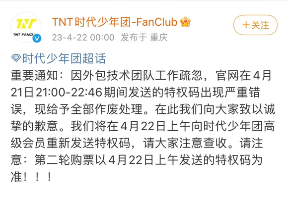 开票前,官方称在两年前购买过演唱会的人,可以收到官方发送的特权码,小紫蹭到了某位脱粉朋友的“团票特权”,却被告知特权也有时限。