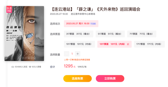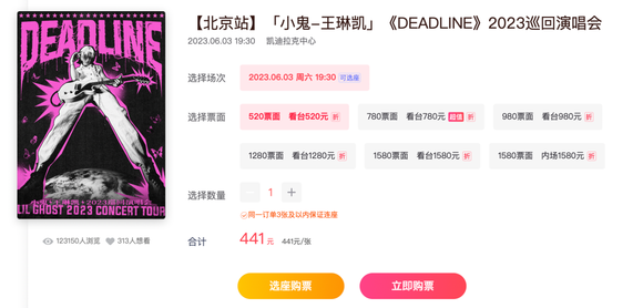 同样出现折扣票的还有华晨宇武汉2场演唱会,地址是能容纳8万人的园博园。看来,这些音综常客、话题歌手与演唱会第一梯队的五月天、周杰伦、张杰、薛之谦已存在不小差距。