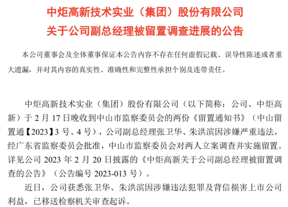 5月19日,在副总经理张卫华、朱洪滨被留置调查三个月后,中炬高新公告称,两高管因涉嫌违法犯罪及背信损害上市公司利益,已移送检察机关审查起诉。