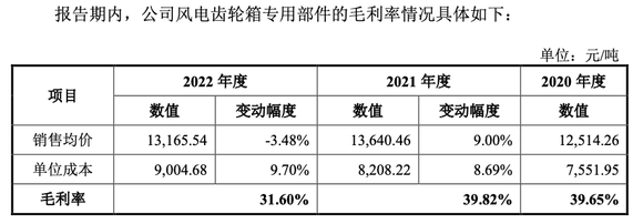可以看到,2021年,锡华科技的风电齿轮箱专用部件销售均价涨幅能够覆盖单位成本涨幅,因此毛利率微弱上升,而2022年,该产品单位成本保持上涨,而销售均价却出现下滑,这是为何?