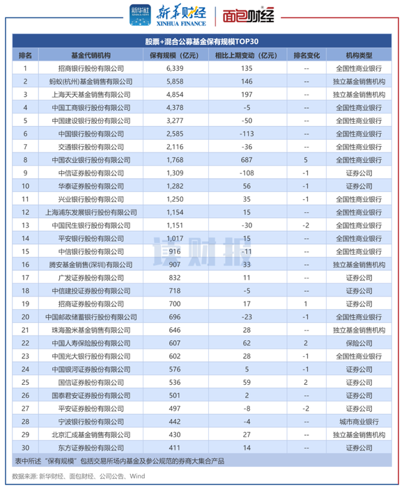 从单季保有规模变动来看,蚂蚁基金、招商银行规模增长较多,中信证券、建设银行、中国银行下降明显。