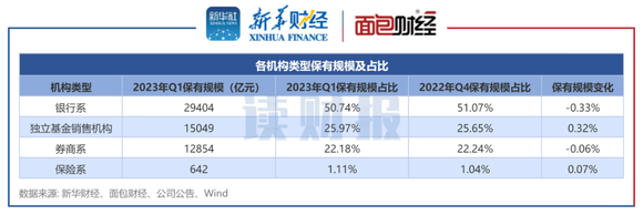 以股票+混合公募基金保有规模为例,2023年一季度末银行系机构合计保有规模约29404亿元,占比达到50.74%,但相较2022年四季度末下降0.33个百分点。