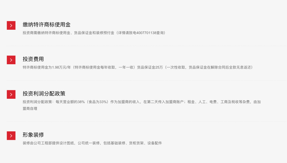 据当前名创优品官网显示,加盟商投资需缴纳特许商标使用金、货品保证金和装修预付金。具体来看,特许商标使用金为1.98万元/年(特许商标使用金每年收取,一年一收),货品保证金25万(一次性收取,货品保证金在解除合同后全款无息返还),另外,门店租金、人工、电费、工商及税收等杂费,由加盟商自理。