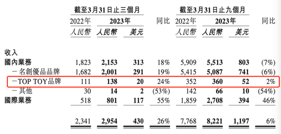 单看本季度,财报显示,TOP TOY门店平均数量同比增加28.7%,门店平均单店收入同比减少3.7%,因此单店平均收入下降不仅体现在名创优品杂货门店类型上,连TOP TOY也不能幸免。另外,本季度TOP TOY门店的收入同比得到24%的增长,不过,从截至3月31日止九个月来看,TOP TOY门店的收入仅同比增长2%。