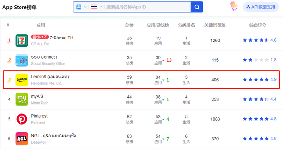 截至5月9日,Lemon8在泰国生活榜应用中排名第三,图源点点数据