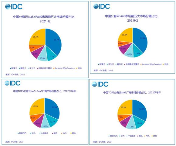 2022年开始,这样的领先局面开始逐渐收缩甚至急转直下,据IDC发布的《中国公有云服务市场(2022下半年)跟踪》报告显示:公有云IaaS+PaaS 市场,阿里云份额由 36.7% 减少 4.8% 至 31.9%;公有云 IaaS 市场,阿里云由 37.8% 减少 5.2% 至 32.6%。