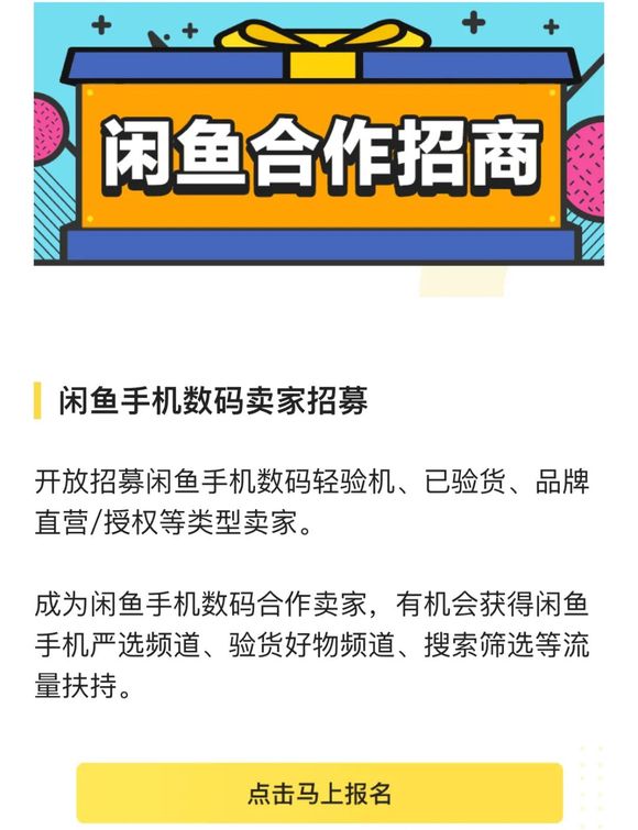 去年,闲鱼开通了合作招商渠道,即闲鱼小铺,其中线上招商招募有手机数码卖家、卡券放心充卖家、二手车卖家、百币夺宝奖品供应商四大类,每一类卖家成为闲鱼合作卖家后,都将获得不同程度的扶持,如成为闲鱼手机数码合作卖家后,就有机会获得闲鱼手机严选频道、验证好物频道、搜索筛选等流量扶持。
