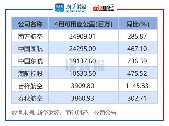 从同比增幅来看,6家航空公司的4月可用座公里均同比增加,且增幅较大。其中,吉祥航空4月可用座公里同比上升1145.83%,增幅最大;中国东航以736.39%的增幅排在第二位。