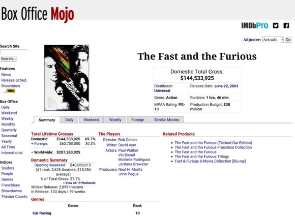 即便《速度与激情》在剧情方面没有跳出好莱坞传统警匪动作片的套路,3800万美元的制作成本在好莱坞也算不上是大制作,而且还被列为“13岁以下儿童需在家长陪同下观看”的B级片。但它在与《哈利波特与魔法石》《指环王1》《尖峰时刻2》等经典影片的同场较量中,仍以2亿美元的全球票房位列当年全球票房排名的第18位。