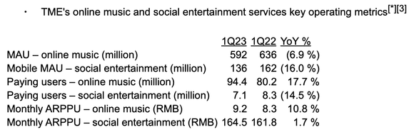 TME一季度在线音乐付费用户环比增长590万,达到9440万;在线音乐付费率15.9%,达到历史新高;在线音乐ARPPU连续四季度增长,达到9.2元,三者共同推动在线音乐订阅收入同比增长30.4%,达到26亿元。