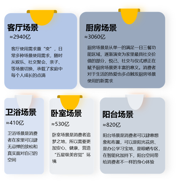 回顾2022年,在全球复杂多变的经济背景以及国内疫情多发情况下,中国家电产业表现稳健,彰显出较强的产业韧性,多项指标均实现增长。从消费视角出发,基于用户使用场所划分,可将当前家电产业划分为客厅、卧室、厨房、阳台和卫浴总计五大场景。