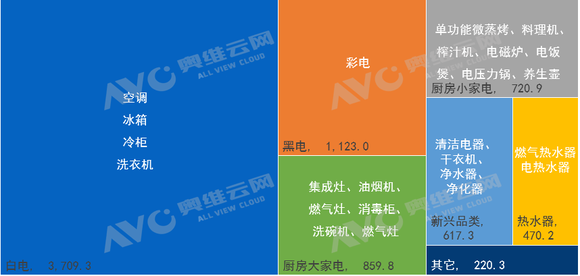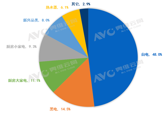 根据2022年奥维云网(AVC)推总数据显示,在中国家电零售市场中,以冰洗空为主的白色家电占比最高,白色家电销售额为3709.3亿元,市场占比48.0%;其次是黑电为主体消费电子产品(不含手机数码产品,包含智能投影等IOT产品)规模为1123.0亿元,占比14.5%;此外,厨房大家电也已经成长为行业的重要品类之一,2022年零售市场规模为859.8亿元,占比11.1%;而厨房小家电规模为720.9亿元,占比9.3%;热水器规模470.2亿元,占比6.1%。