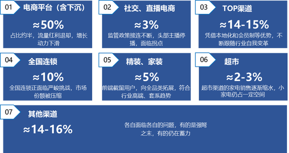 (2)渠道变革形势仍不明朗。大连锁渠道持续萎缩,新兴渠道不断崛起,碎片化进一步加剧,为家电行业带来诸多不确定性与挑战。