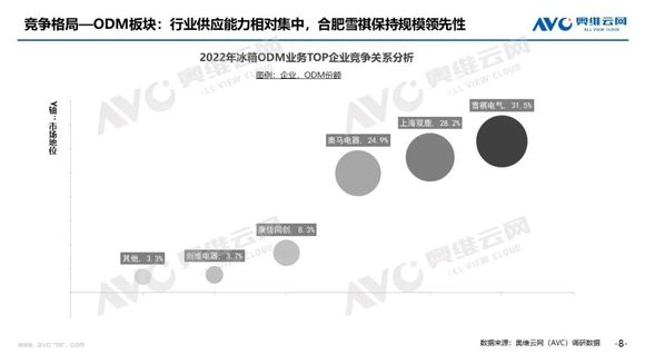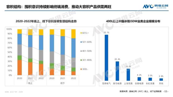 大容积需求的增长,也直接影响到了供给端的企业格局。在中国冰箱内销市场的ODM制造业务中,400L以上大容积冰箱的出货备受关注。奥维云网(AVC)调研数据显示,2022年中国冰箱内销市场的ODM业务中,400L以上冰箱板块呈现单寡头、高集中度的竞争局面。其中雪祺电气、奥马电器和上海双鹿位居前列,出货量占比分别为53.1%、22.4%和14.0%,TOP3品牌出货量占比高达89.5%,同比呈增长态势。这也表现出中国内销市场中,大容积冰箱巨大的市场潜力以及大容积冰箱ODM业务的竞争压力。(戳→奥维数据罗盘)