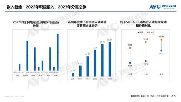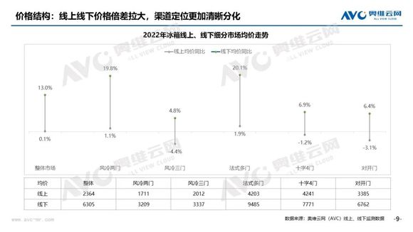 奥维云网(AVC)监测数据显示,2022年冰箱线上、线下市场零售均价同比分别增长0.1%和13.0%。线下各细分市场均保持稳健的价格增长能力,线上价格竞争激烈程度趋于温和,风冷三门、十字和对开的价格降幅均低于5%。